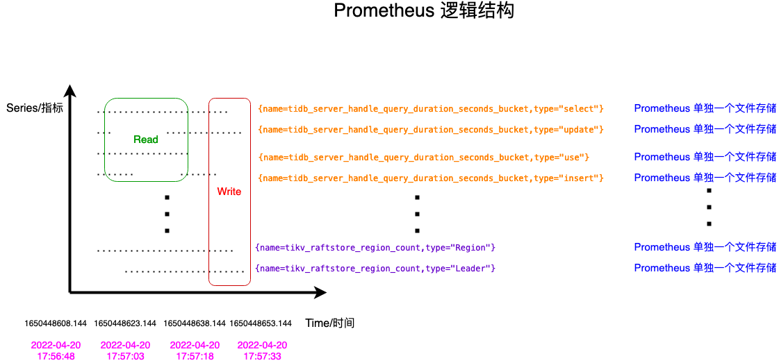 Prometheus Metric 配合 Label 会分拆成有限个指标,反映成二维平面上的点,在运算时通过取 交集 或 并集 实现 Metric 的聚合。每个指标点随时间的增加指标值的变化情况会保存在一个文件中,实现了并行读、写极大,提高了性能。