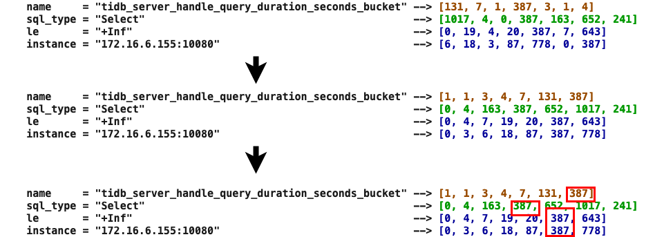 } 假设取 tidb_server_handle_query_duration_seconds_bucket { instance = "172.16.6.155:10080" , sql_type = "Select" , le = "+Inf" } [2m] 的瞬时值。第一步,从 prometheus 存储中截取对应时段的数据后对数据结果倒排重构。第二步,取各文件结果交集得出 Metric 在 2min 内的所有值。