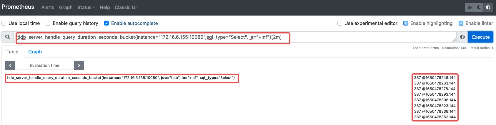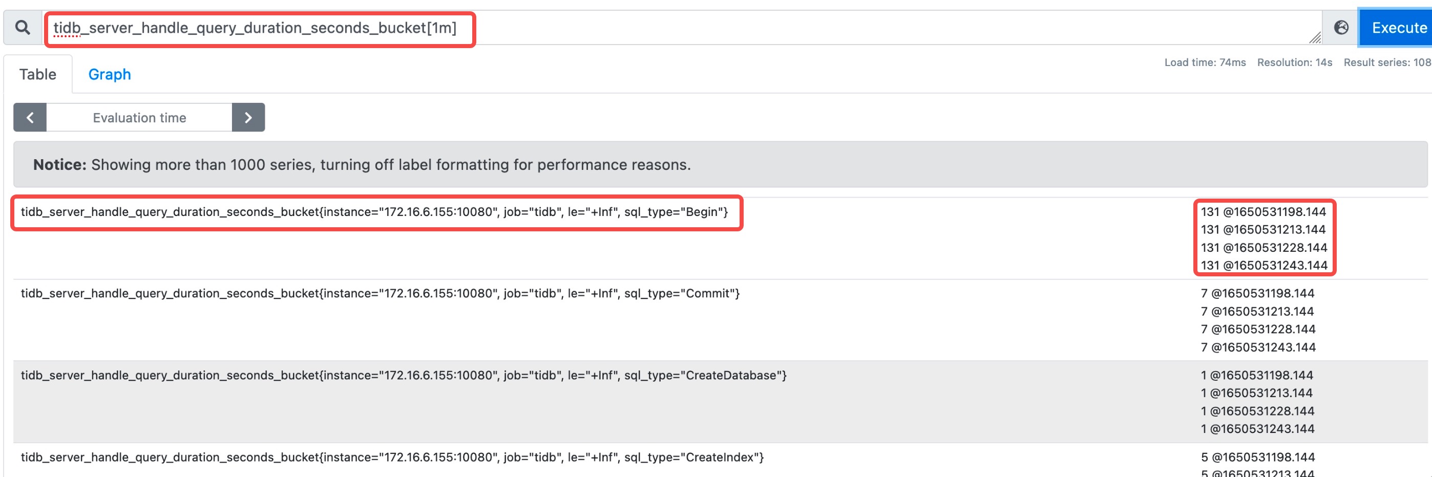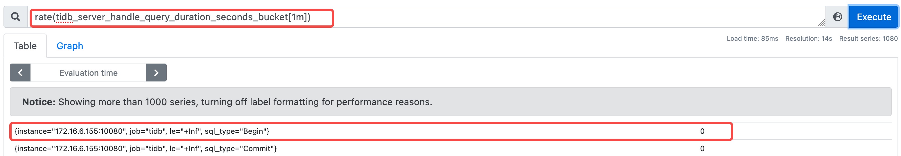 rate(tidb_server_handle_query_duration_seconds_bucket[1m]) rate 函数表示数据点做差,函数原理参考上文。结果显示 1min 内标签为 {instance="172.16.6.155:10080", job="tidb", le="+Inf", sql_type="Begin"} 的指标聚合结果的增量为 0,又因为 prometheus 中保存的是累计值,在 rate 做差后,刚好表示这 1min 内符合 Lable 的指标聚合的增量。