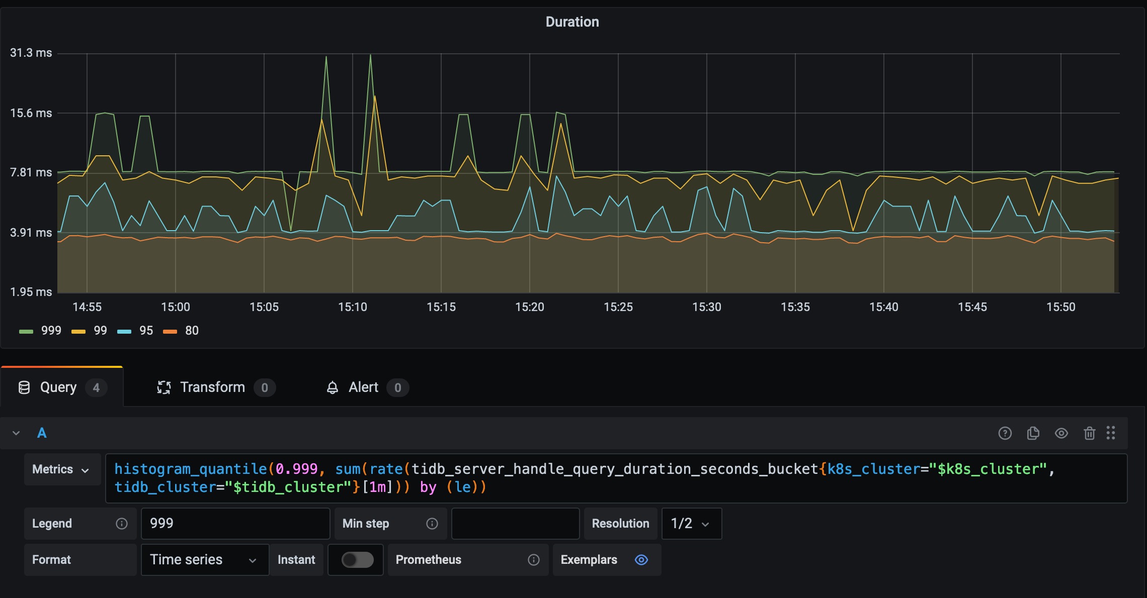 histogram_quantile(0.999, sum(rate(tidb_server_handle_query_duration_seconds_bucket{k8s_cluster="$k8s_cluster", tidb_cluster="$tidb_cluster"}[1m])) by (le))