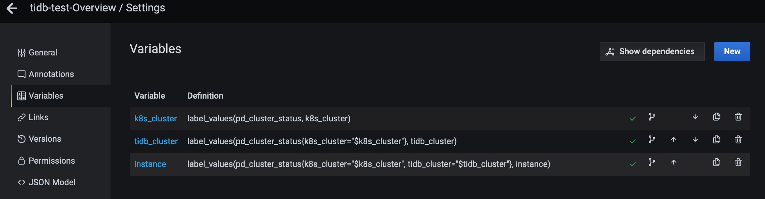 至于 {k8s_cluster="$k8s_cluster", tidb_cluster="$tidb_cluster"} 标签过滤可以暂时忽略,他是通过 Grafana 变量机制实现的过滤 TiDB Cluster 相关指标的机制。这里主要关注 Prometheus 如果实现数据的聚合,暂时忽略多集群数据的问题。对该问题,详情参考 grafana 变量机制 深入研究。