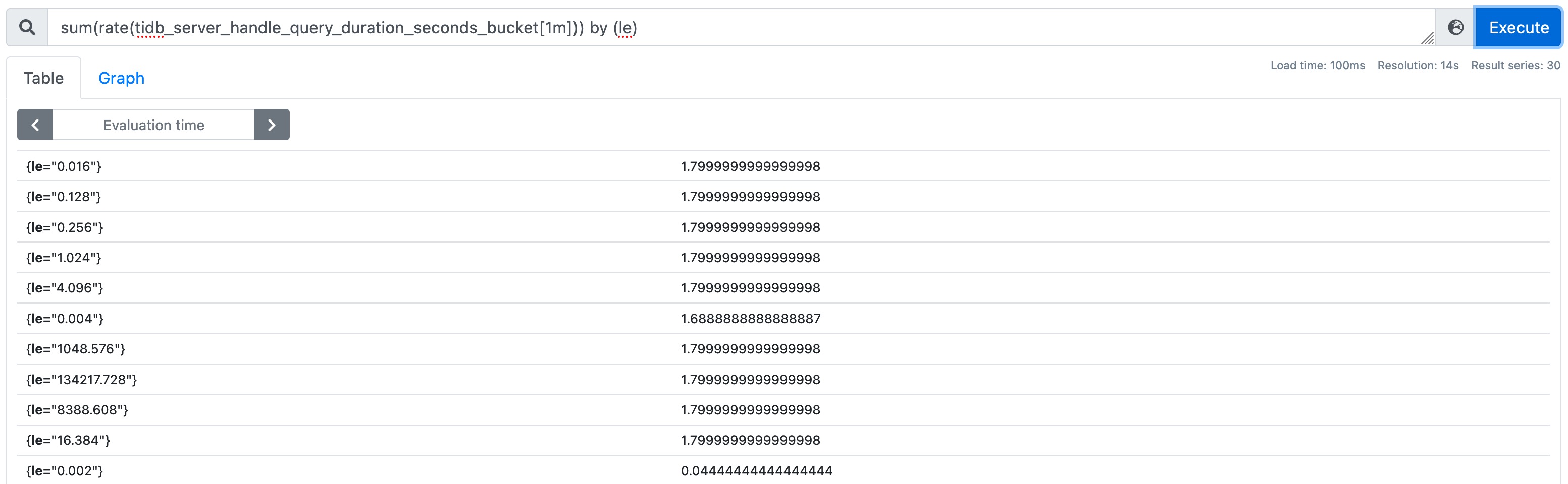 sum(rate(tidb_server_handle_query_duration_seconds_bucket[1m])) by (le) sum( Metric_XXX ) by (le) 运算目的是为了,聚合除 le 标签外的所有其他指标结果,也就是屏蔽 sql_type、job、instance 的 Label 差异,结果如下: